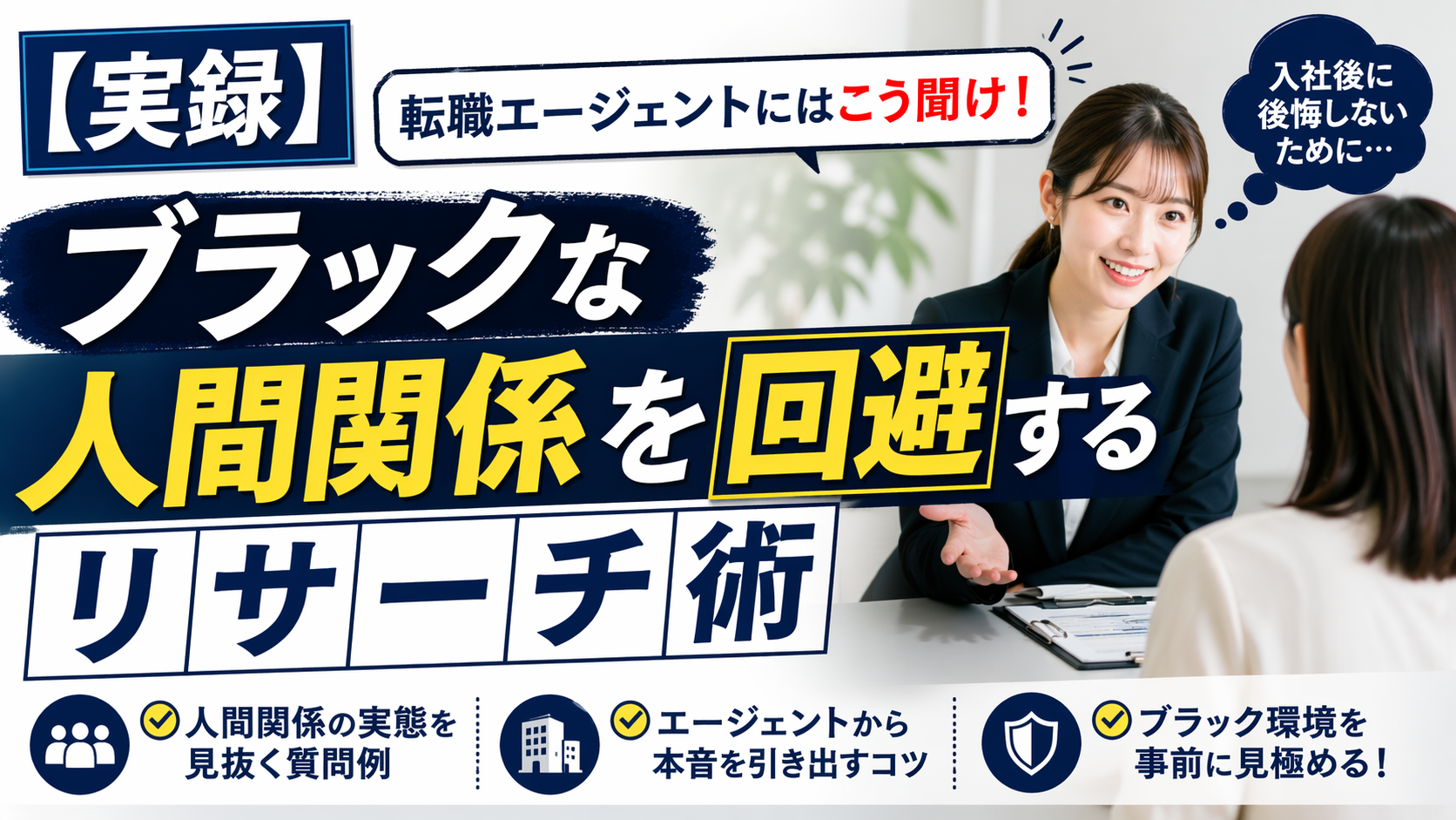 これに対しては、入社前にできる限り情報を集めることが有効です。転職エージェントを利用すると、企業の内部情報(社風・残業・人間関係など)をある程度教えてもらえることがあります。面接での質問も、雰囲気を掴む大切な機会です。